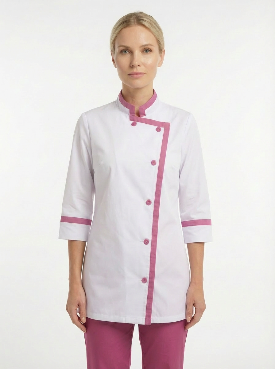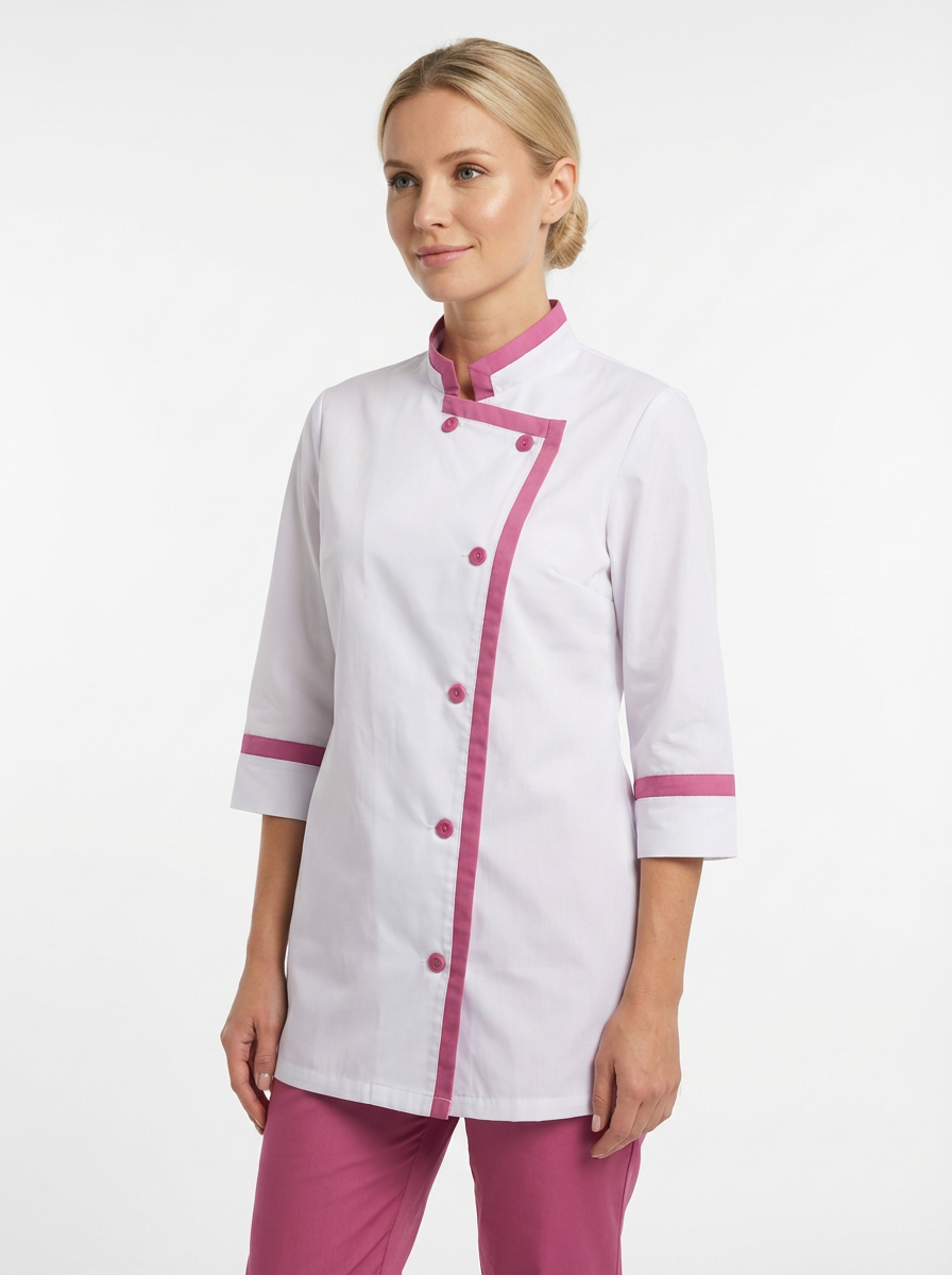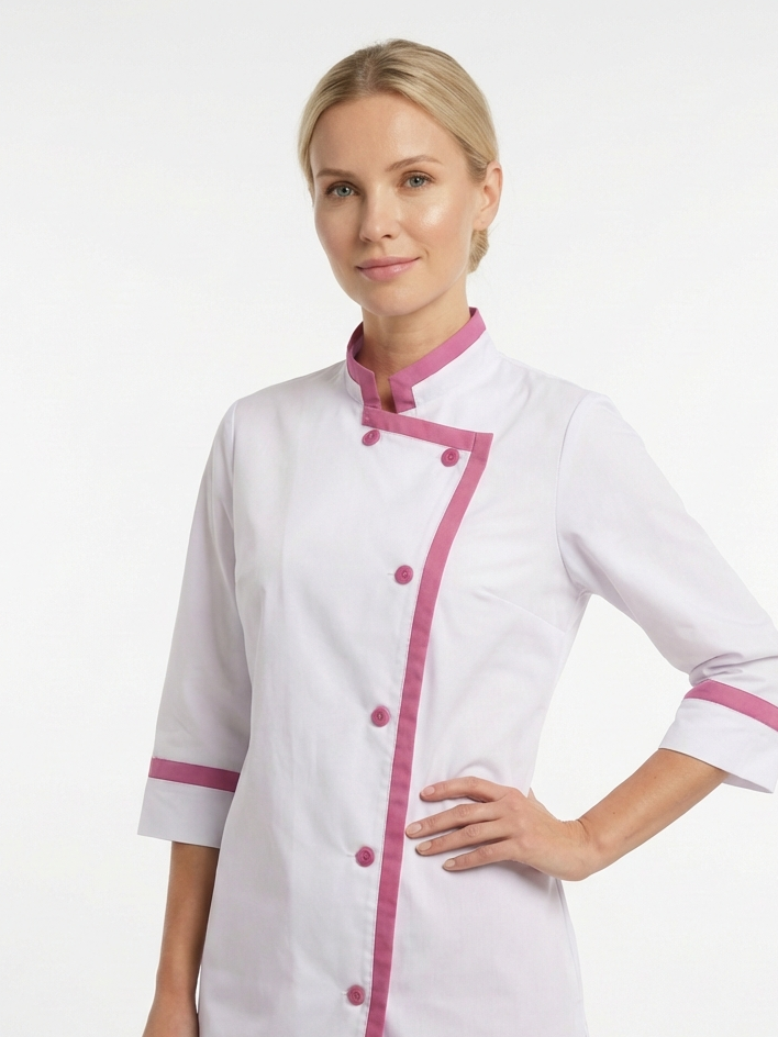 Костюм для повара состоит из куртки и брюк.Куртка прямого силуэта с втачными рукавами, длиной ¾, со смещенной бортовой застежкой на 6 пуговиц, воротником стойка.Рукава втачные одношовные.Брюки прямые, длинные, с накладным карманом на правой половинке брюк, без застежкиПояс брюк притачной, на резинке, со вставкой посередине переда.