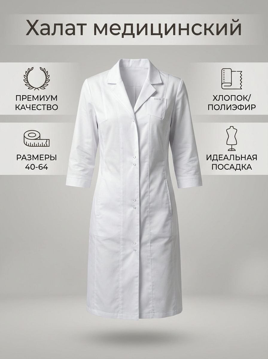 Халат полуприлегающего силуэта с центральной бортовой застежкой на разъемную тесьму «молния», втачными короткими рукавами.