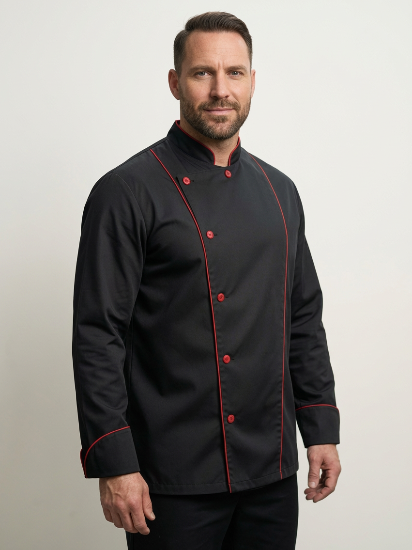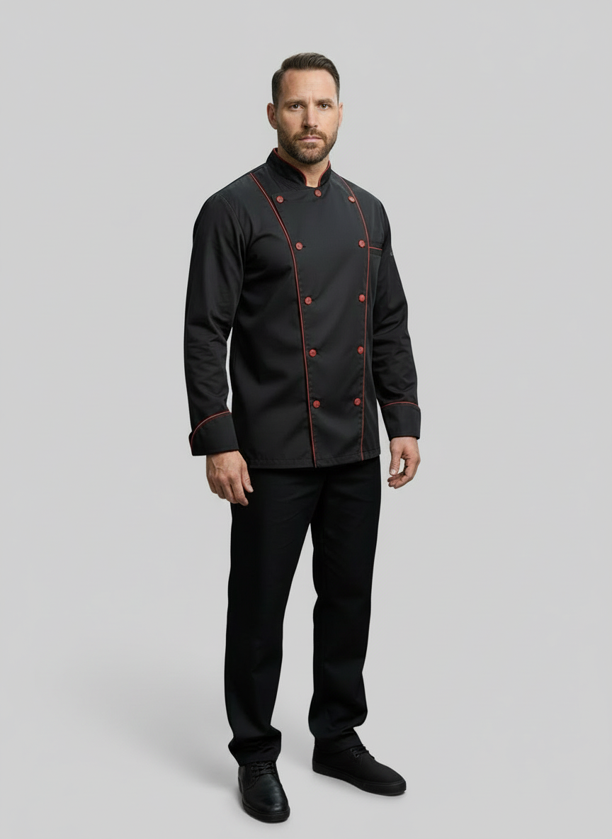 Комплект для повара, состоит из куртки, брюк, колпака, фартука и банданы. Куртка двубортная прямого силуэта со смещенной застежкой на петли – пуговицы. Рукава втачные, одношовные с притачными планками из отделочной ткани.